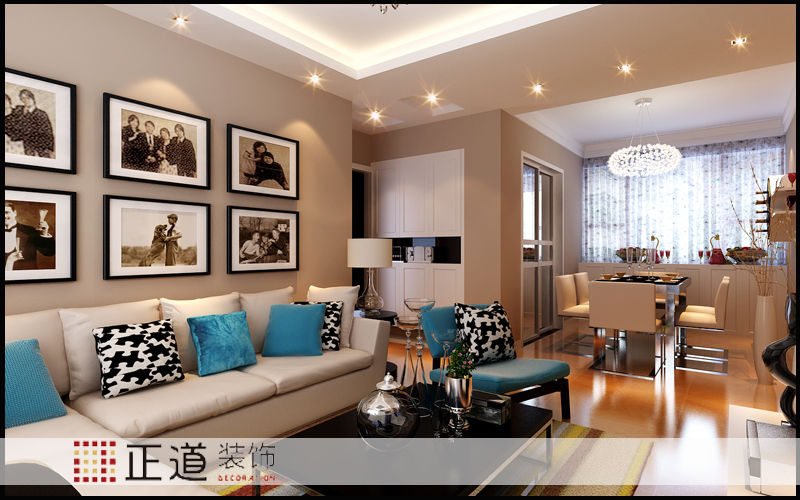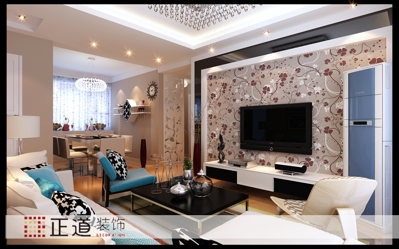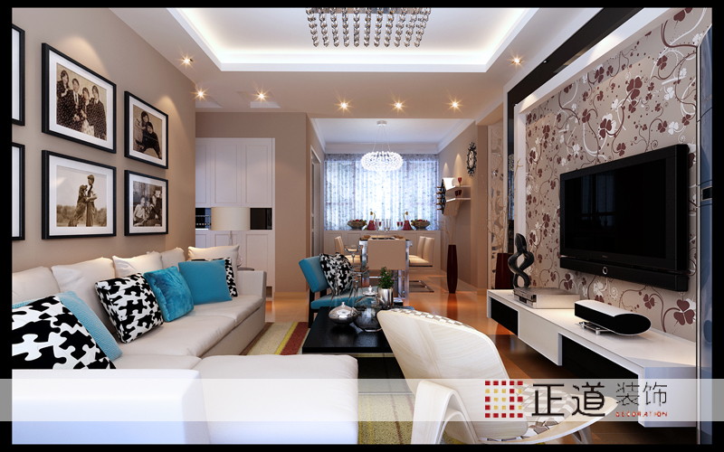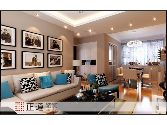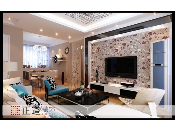 客廳沒有做過多的造型修飾,電視背景墻大面積的墻紙進行裝飾,用石膏板和鏡面進行收邊打框,沙發背景的墻面和家里整體一樣進行了調色,用簡單的裝飾畫進行點綴裝飾,體現的是簡約、時尚氣息,彰顯了空間的整體格調,也提升了主人的品位和格調。