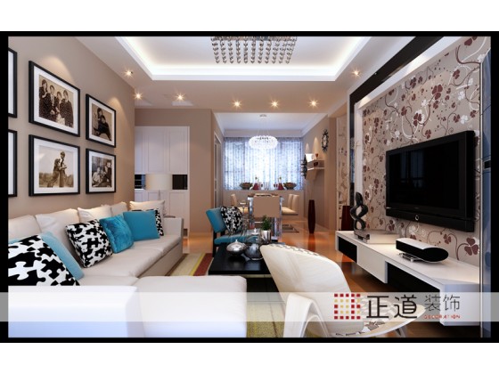 客廳沒有做過多的造型修飾,電視背景墻大面積的墻紙進行裝飾,用石膏板和鏡面進行收邊打框,沙發背景的墻面和家里整體一樣進行了調色,用簡單的裝飾畫進行點綴裝飾,體現的是簡約、時尚氣息,彰顯了空間的整體格調,也提升了主人的品位和格調。